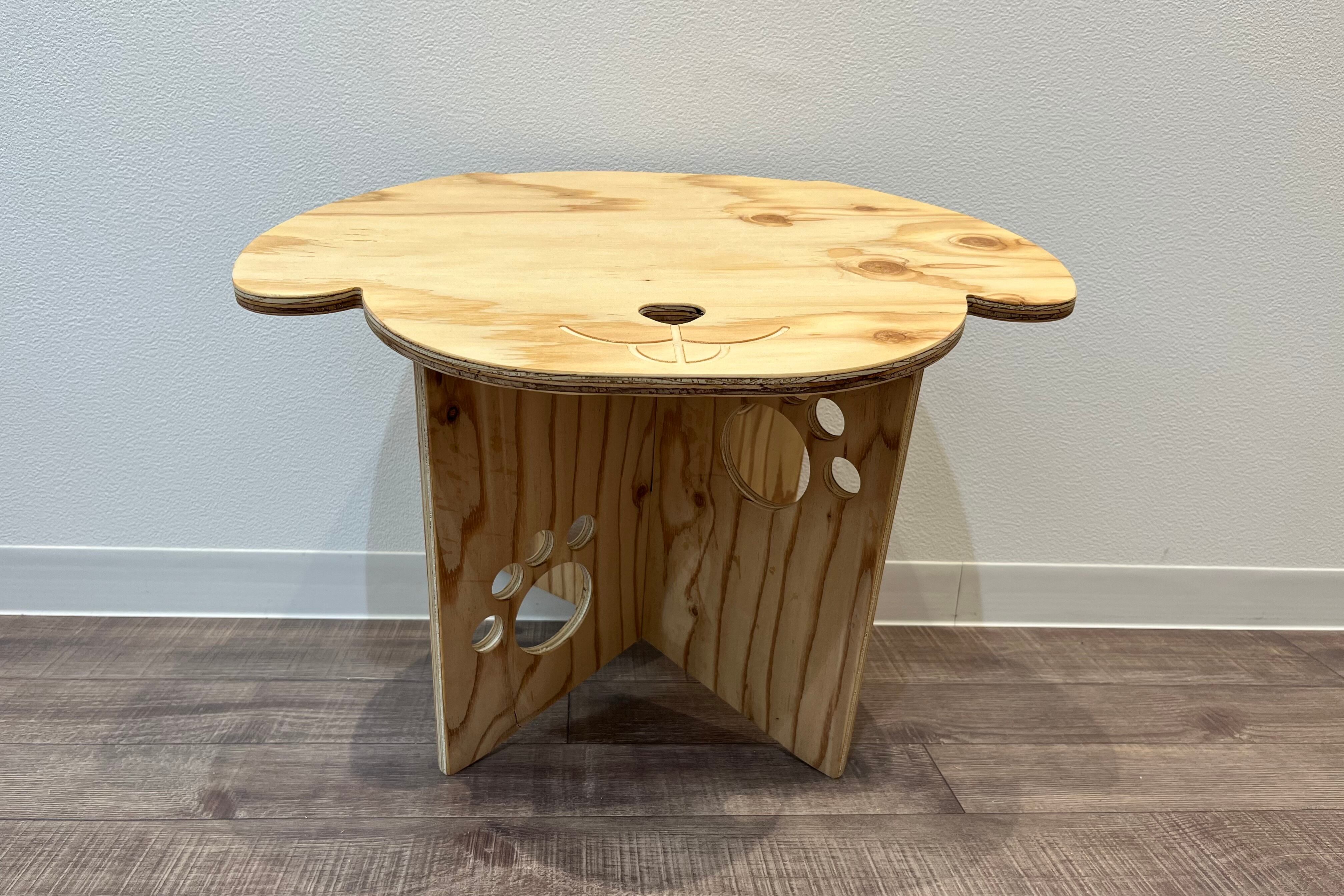 テーブル天板の顔に、くり抜いた鼻や口の彫刻を施した可愛いテーブルです。