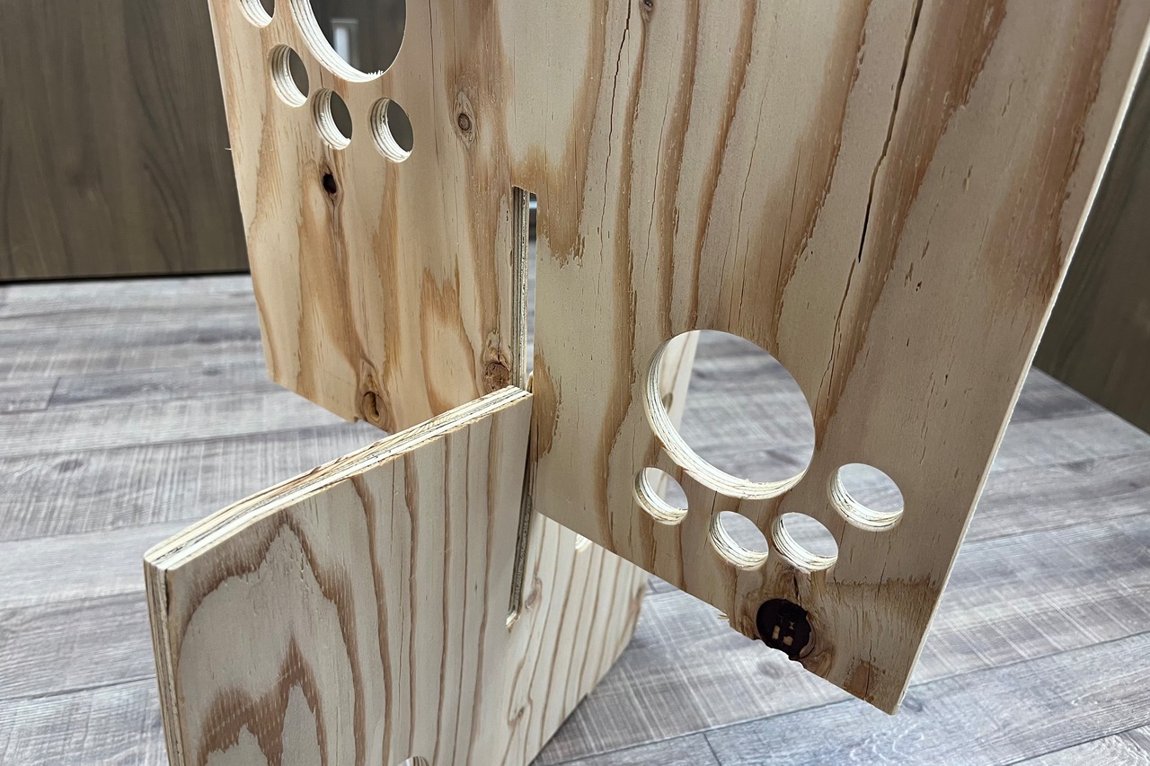 脚のパーツに開いている穴に、もう1枚の脚を重ね入れ、天板をはめるだけで完成!!