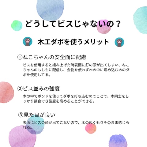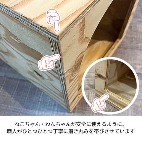 天然木を使用し、猫ちゃんわんちゃんが遊んでいても怪我がないよう木の切り口を処理してあり、一つ一つ職人が心を込めて手作業で作っています。