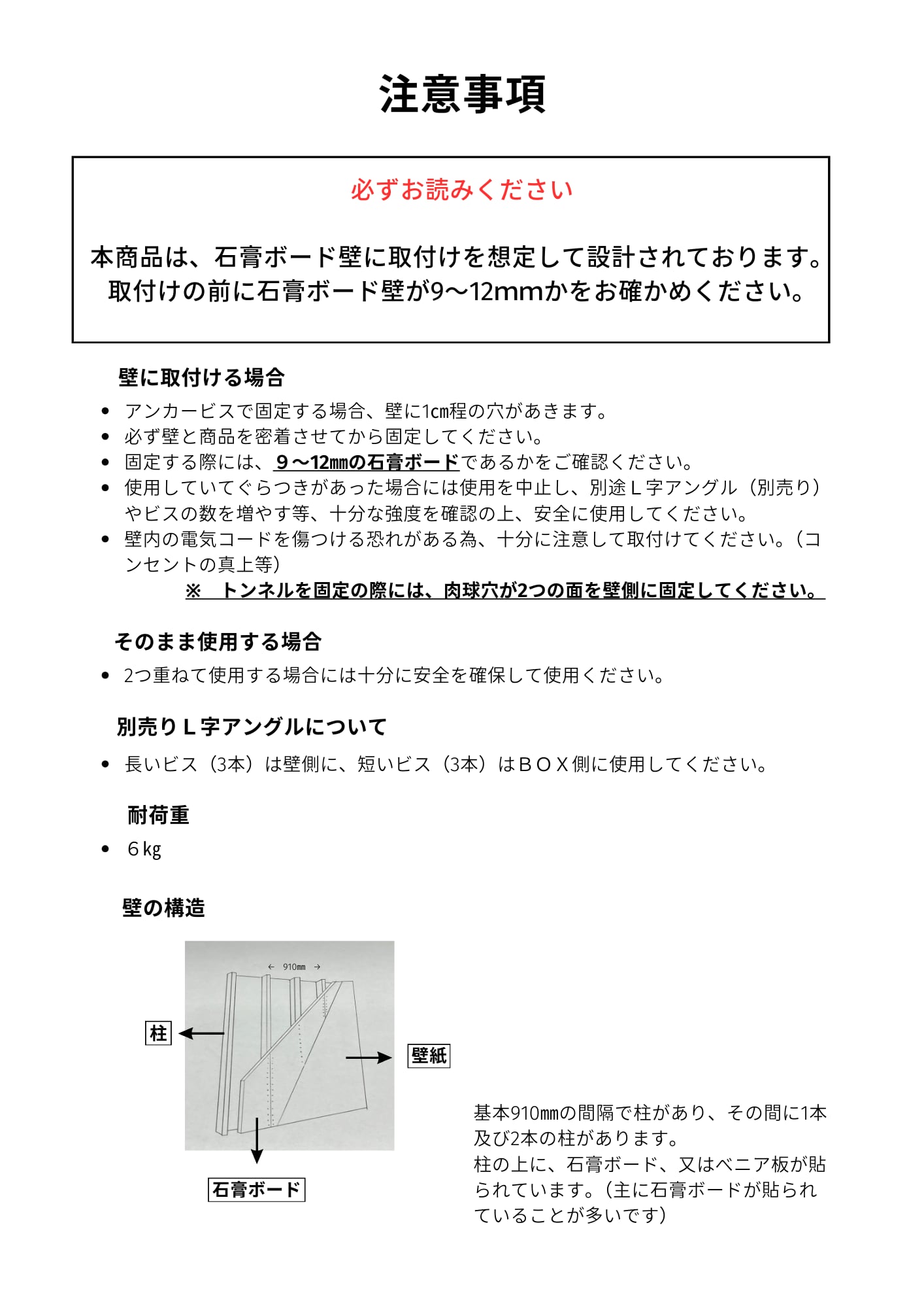 壁に取り付ける際には、BOXと壁を固定の上、必ずLアングルで補強をお願いいたします。